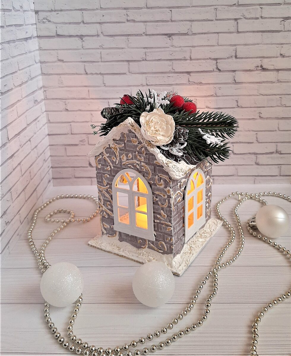 Доброго дня, продолжаю тему светильников и свечей! Свет из окон домов в темноте дарит ожидание того, что дома тепло, уютно и вас ждут родные люди. Пусть мой маленький светильник запечатлеет это настроение и будет напоминать о нем зимними вечерами))). Для такого домика понадобится: переплетный картон 2 мм, картон канцелярский 0,5 мм, шпатлевка, трафареты, краски акриловые (белая, коричневая), лак акриловый, горячий клей, клей ПВА, глиттеры, декоративные элементы (еловые ветки, ягоды, цветок, шишки и ветки из фоамирана, веточки из бисера), кисти, резак, ножницы, ножи для вырубки, наждачная бумага. Вырезаем из картона детали, размеры указаны на фото. Четыре стены: Две одинаковые детали крыши и пол: Из обычного картона 0,5 мм с помощью ножа для вырубки вырезаем 6 одинаковых заготовок оконных рам, а затем склеиваем по 2 шт., получая 3 плотных заготовки: В деталях стен вырезаем отверстия по размеру полученных окошечек и в одной стене прорезаем полукруглый вход. Размер входа-двери будет зави