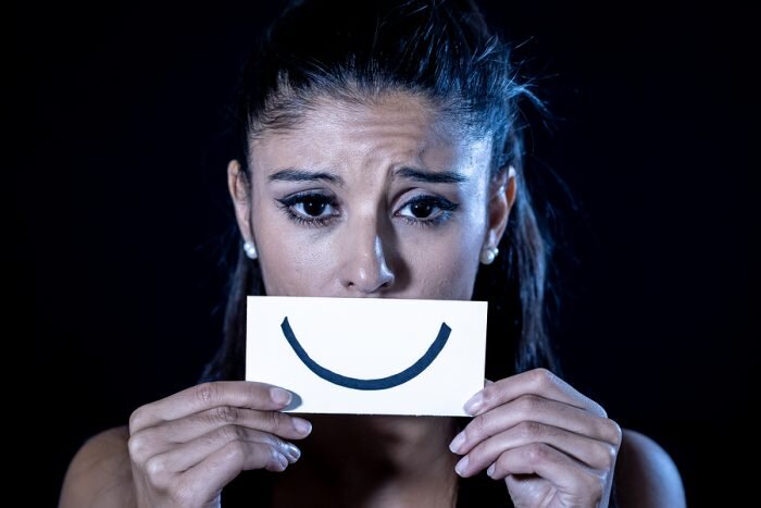 Иногда скрытую депрессию называют «улыбающейся депрессией». Причина этого в том, что люди, которые скрывают свои симптомы, стараются делать, чтобы их лицо выглядело счастливым, находясь в компании других людей. Однако трудно поддерживать это вынужденное состояние счастья и позитива. Со временем маска может соскользнуть, и у человека могут появиться признаки печали, безнадежности и одиночества.
