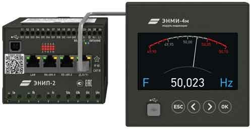 Наиболее популярная модель ЭНМИ‑4м имеет цветной сенсорный дисплей, а для удобства навигации еще и кнопочное управление. Экранные формы, доступные пользователю, разнообразны: это имитация стрелочных приборов, цифровые табло, графики и диаграммы. При необходимости пользователь может самостоятельно настроить необходимую мнемосхему контролируемого присоединения и привязать элементы этой мнемосхемы к дискретным сигналам. Таким образом, ЭНМИ, установленный в ячейку КРУ, может заменить щитовой прибор и табло мнемосхемы присоединения.