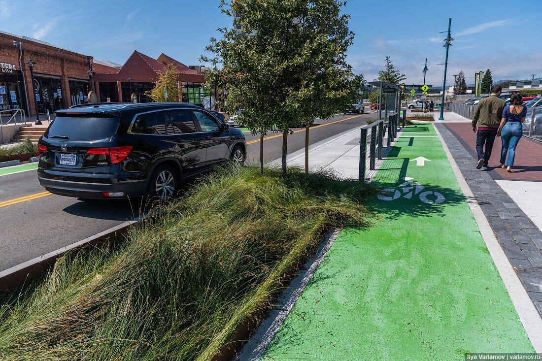 С тех пор город стал активно обрастать клумбами, дождевыми садами, зелёными крышами, искусственно заболоченными биотрясинами и так далее. Около 30% асфальта заменили на водопроницаемое дорожное покрытие, которое, кстати, было изобретено здесь же, в Филадельфии, Институтом Франклина аж в 1977 году. Вдоль дорог появилась сеть траншей, выложенных водопроницаемой геотканью, наполненных камнями или гравием и замаскированных сверху почвой и деревьями. Благодаря этому город кардинально преобразился, сравните правую часть фото (до) и левую (после):