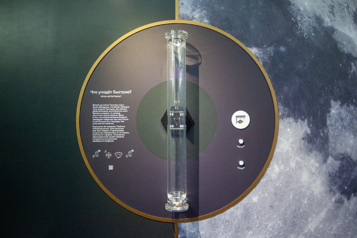 Идея вакуума (пустоты) была предметом споров очень давно – со времён древнегреческих философов. Атомисты считали, что без пустоты (вакуума) не было бы движения. Аристотель и ряд других философов, наоборот, полагали, что «природа не терпит пустоты». Эмпирическое изучение вакуума началось лишь в XVII веке с началом научной революции Нового времени. Так что же такое вакуум? Самое простое объяснение – пространство, свободное от вещества. А как ведут себя предметы в условиях пустоты? Оказывается, одинаково, вне зависимости от массы, плотности и формы. В условиях земной атмосферы предметы ведут себя иначе. Если бросить лист бумаги и камень, то камень достигнет земли первым. Сопротивление воздуха замедляет падение: чем тело легче и чем больше его площадь, тем сильнее это заметно. Все эти наблюдения наглядно иллюстрирует экспонат Лунариума «Что упадёт быстрее?». Если откачать из стеклянной колбы воздух, шарик и перышко будут падать с одинаковой скоростью и достигнут дна одновременно. Если зак