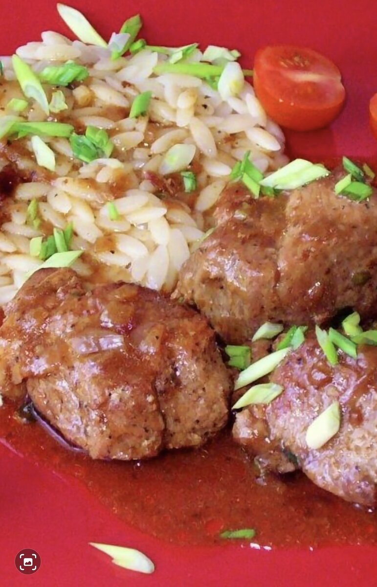 Паста Орзо, с луково- мускатным соусом и свининой.