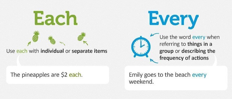 Под статьей про Present Simple задали вопрос: EVERY и EACH - одно и то же, или есть особенности? А Вы знаете разницу? Давайте разбираться. Оба местоимения имеют одно и то же значение – "каждый". Общее правило использования данных местоимений таково, что Each употребляется когда речь идет о двух и более предметах или вещах, Every – когда речь идет о трех и более предметах или вещах. The melon was split into two halves; each half was given to them.