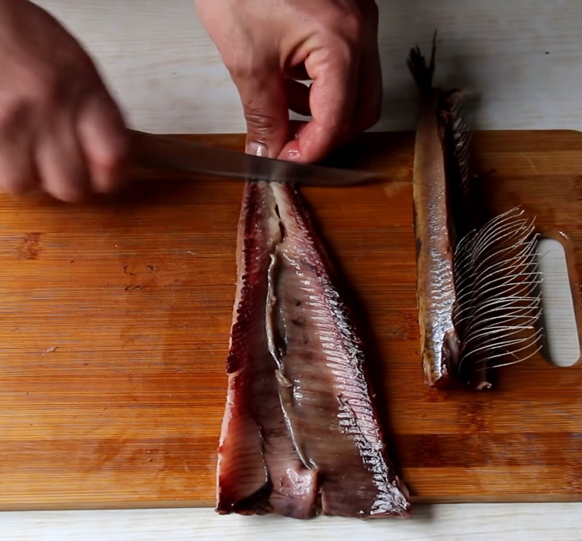 Селёдку необходимо разрезать по хребту, а в том месте, где расположен плавник, следует сделать глубокий надрез с обеих сторон, чтобы удалить его без проблем.