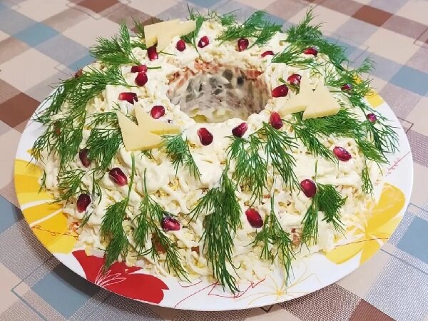 Этот салат с говядиной — праздничное блюдо, легкое и освежающее, которое станет идеальной зимней праздничной закуской на новогоднем или Рождественском столе. Мои приготовления к зимним праздникам всегда включают поиск новых блюд, которых мы раньше не пробовали. Это не исключает обязательного салата оливье и торта наполеон на нашем столе, но хочется и чего-то новенького. Среди находок нынешнего года — слоеный салат с говядиной, овощами и яйцами под названием «Рождественский венок». Готовится он из простых ингредиентов, которые, думаю, любая хозяйка найдет у себя в холодильнике перед зимними праздниками. Это простая, сытная и вместе с тем красиво поданная закуска, которую обязательно оценят и гости, и домочадцы. Салат готовится в виде кольца и украшается зеленью и зернами граната. На столе смотрится очень привлекательно и — самое главное — съедается быстро и с удовольствием. Ингредиенты: Приготовление: Кусок говяжьей вырезки очистите от плевы и вкраплений жира, положите в воду и варите б