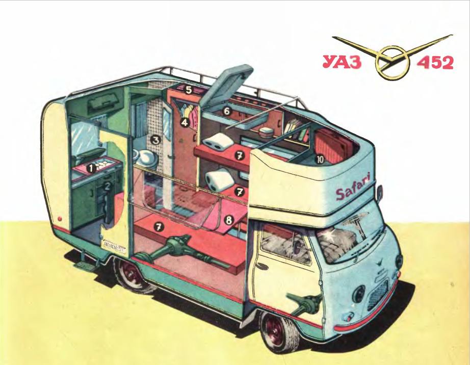 "Советский автомобиль пересекает Сахару" Нельзя сказать, что традиционная легковая машина очень уж подходит для дальних поездок с ночлегом «где придется», по бездорожью или скверным дорогам. Для такого дела нужен автомобиль, оснащенный всем, без чего не обойтись в путешествии. Вашим домом в дороге может автомобиль "сафари" разработка итальянской фирмы «Арка». Машина эта так называемый автокараван приспособлена для езды по бездорожью, незаменима в экспедициях, дальних путешествиях. Ее основа очень прочное, пригодное для работы в тяжелых дорожных условиях шасси советского автомобиля УАЗ-452, который выпускается в модификациях санитарного фургона, грузовой, с закрытым или открытым кузовом машины. Четырехцилиндровый двигатель этого вездехода развивает мощность 80 л.с. Четырехскоростная коробка передач позволяет в любой момент включать демультипликатор. Диаметр разворота машины 12 м. Её максимальная скорость 90 км/час. Одним словом, шасси советского УАЗА находка для автомобиля вроде «сафари
