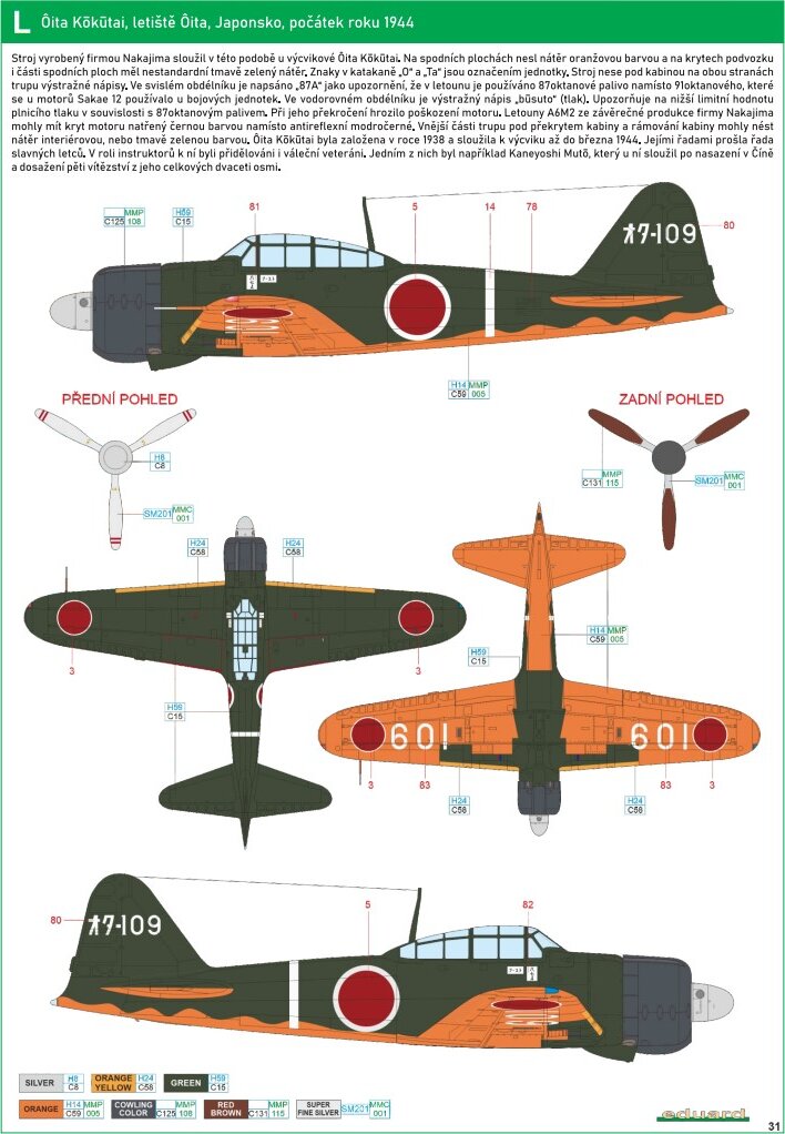 Маркировка L : Oita Kokutai, аэродром Oita, Япония, начало 1944 года. Машина изготовлена на Накадзима, в этом обличии служила в учебном Oita Kokutai. На нижних плоскостях имела оранжевый цвет, а крышки шасси и часть днища были выкрашены в зеленый. Знаки в ”катане” “O” и “Ta” в коде на киле-обозначение соединения. Так же под кабиной на обоих сторонах есть по две предостерегающих надписи . В вертикальной написано “87A”- предостережение что заправлено топливо с октановым числом 87, вместо 91-го, которое использовалось в боевых частях для мотора Sakae 12. И в горизонтальной “busuto”(давление). Предостерегает о снижении степени сжатия топлива, что было обусловлено использованием топлива с 87 октановым числом. При превышении этого значения можно было повредить мотор. Самолеты А6М2 произведенные на Накадзиме , могли иметь черный капот, вместо антибликового сине-черного. Внутреннее пространство под кабиной и , рама могли быть покрашены в цвет интерьера кабины, или темно-зеленый. Oita Kokutai