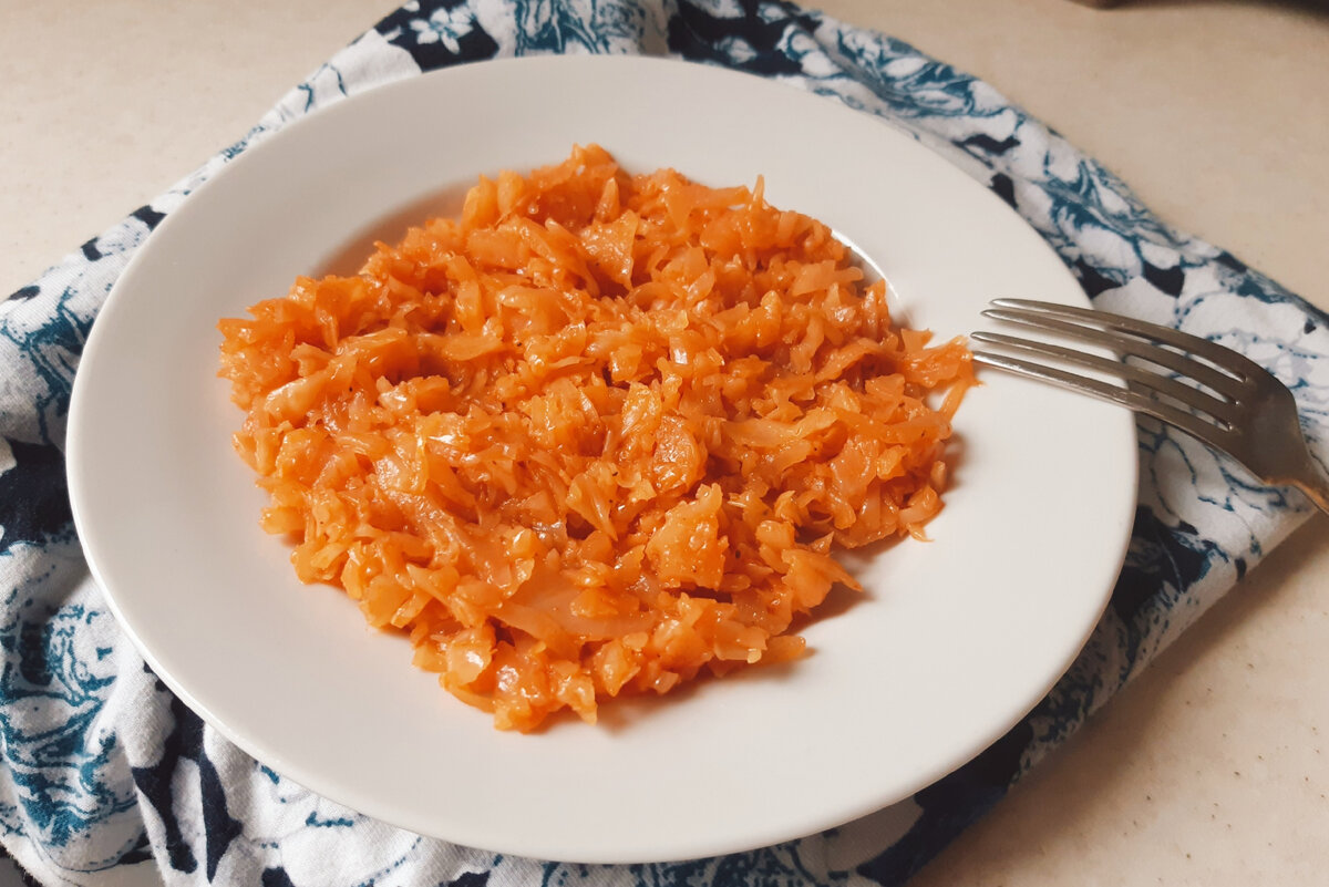 Здравствуйте, уважаемые гости канала! Сегодня приготовим легкое и вкусное блюдо - это тушеная капуста. Готовим без мяса. Такую капусту можно подать на гарнир к мясу или жареной рыбе, а также может быть самостоятельным блюдом. А сама готовка занимает совсем немного времени. Итак, поехали! Ингредиенты: Приготовление: 1. Капусту нарезаем тонко ( шинкуем ). 2. Затем обжариваем её на сковороде в горячем подсолнечном масле на малом огне минут 10 - 15 для того, чтобы размягчилась и осела. 3. После этого перемешиваем, солим, перчим по вкусу. 4. Добавляем томатную пасту, немного воды, всё перемешиваем, закрываем крышкой. 5. В таком виде всё тушим минут 10, пока не выпарится вода. 6. Добавляем мелко нарезанный чеснок за 2 - 3 минуты до готовности. Приятного аппетита!
