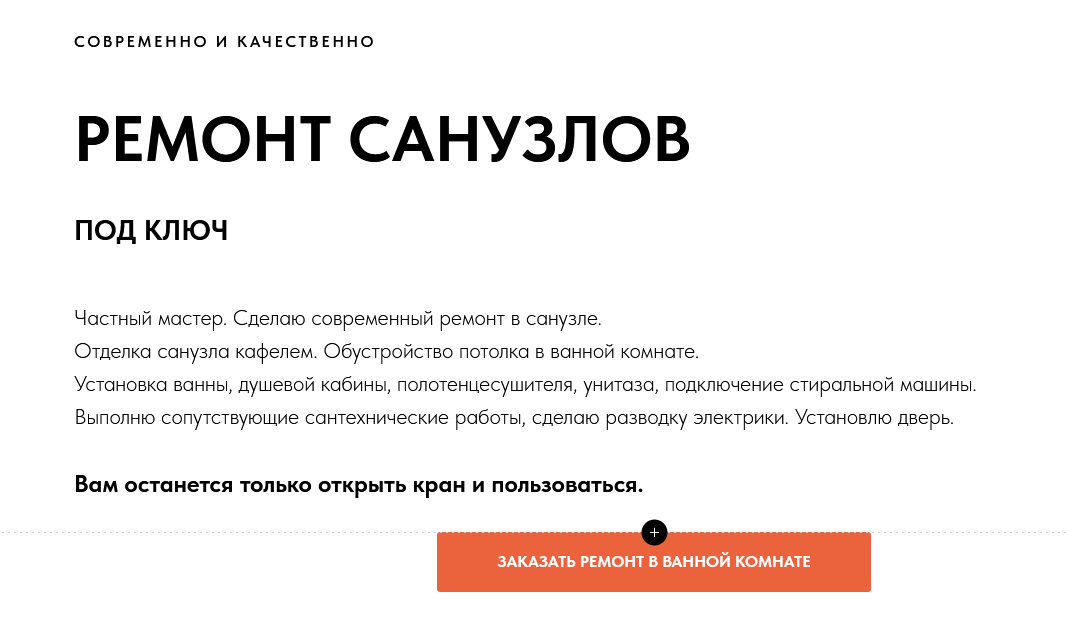 Решили, что сайт будет по моно-услуге, по ремонту санузлов (ванных комнат). Сайт верстался как одностраничный сайт (лендинг) для просмотра на ПК, с адаптацией для мобильных телефонов. Для ПК и ноутбуков дизайн получился немного функциональнее, чем для мобильных. Но это ограничение уже самого конструктора (Тильды).