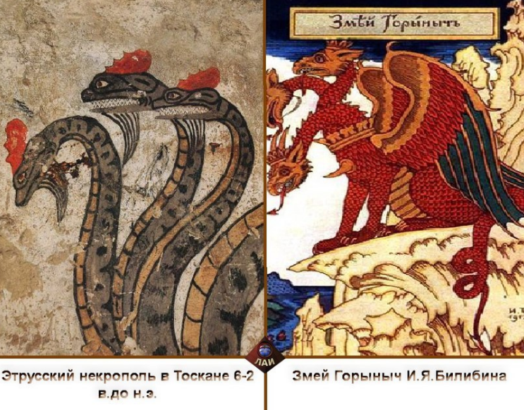 Культуры практически всех народов мира пересекаются в какой-то мере. Например, в истории древних этрусков, что обитали 1 тыс. г. до нашей эры есть существо, напоминающее нашего былинного Змея-Горыныча. Этруски жили на территории современной Италии. В то же время и в Древней Греции, и в Древней Руси были сказания о существах, у которых вместо обычных ног были ноги лошади – кентавры. У нас в 17 в. был популярен кентавр по имени Полкан. В одних сказках он предстаёт как богатырь, в других же фигурирует как «чудище поганое». Но если Италия и Древняя Русь находились относительно близко и какие-то легенды и сказания могли передаваться из уст в уста, то существуют удивительные совпадения на разных уголках планеты. Причём учёные уверены, что наши предки никак не могли пересечься в то время, чтобы рассказать свои истории. Научно выражаясь, это зовётся мифологией. Не нужно искать в ней истину или подтверждение того, что когда-то на земле обитали такие существа. Тут дело в другом. "Совпадений слиш