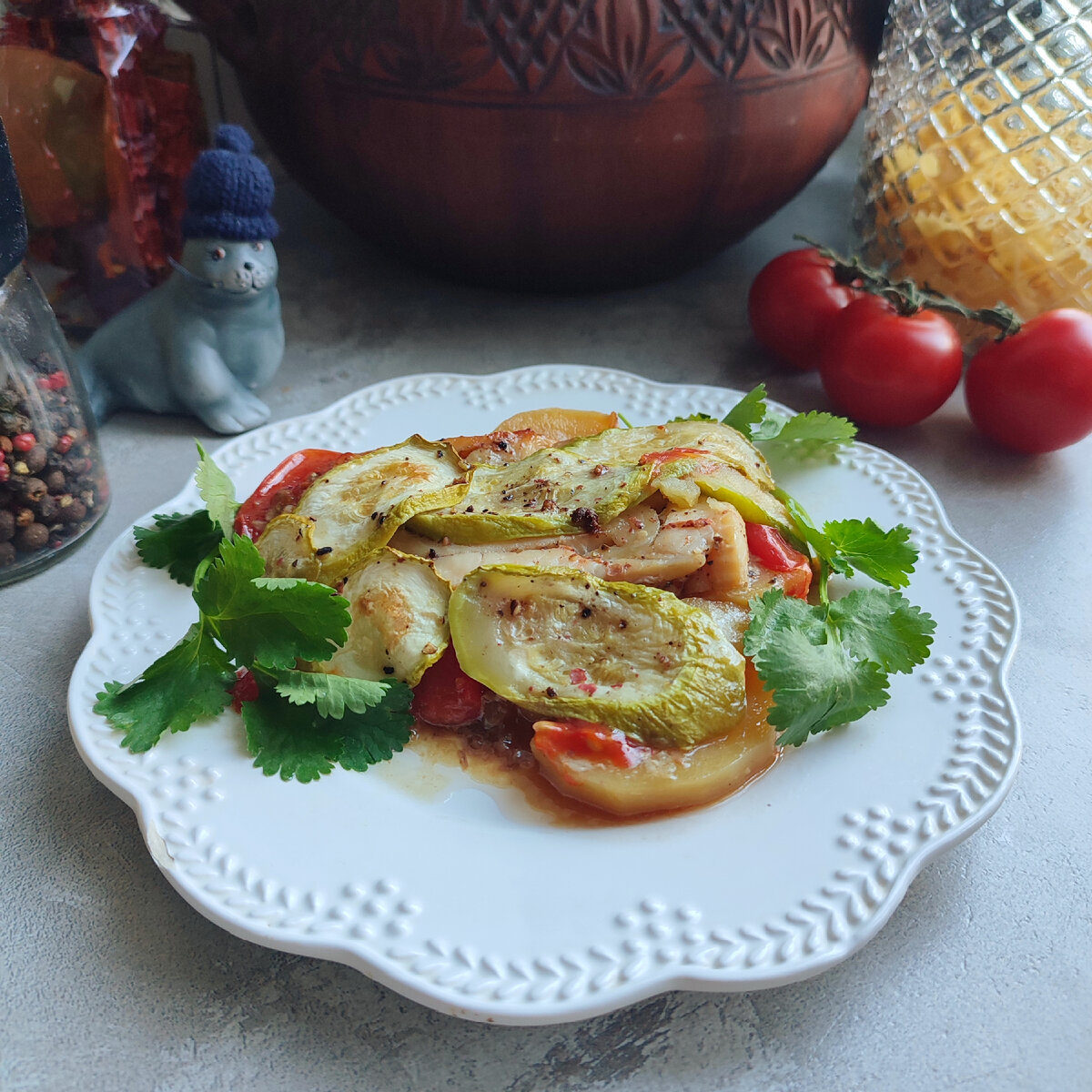 Всё собрали и в духовку - любите такие блюда? Я очень, главное не забыть поставить таймер! Это блюдо я делаю довольно часто, каждый раз немного по разному, но принцип один. Чаще всего запекаю так тилапию, но могу взять и другое филе. В этот раз, в магазине по акции, купила филе камбалы. Мне очень нравится эта рыбка - в ней нет мелких косточек, приятное, чуть сладковатое мясо, не сухая и стоит недорого. Этот рецепт подходит тем, кто соблюдает пост, в дни когда можно рыбу. Соотношение ингредиентов можете менять на свое усмотрение, даю примерный состав на четыре порции. Ингредиенты Для заправки Приготовление: Если рыба замороженная, надо вынуть ее заранее из морозилки и положить в холодильник. Например - я вынимаю из морозилки вечером, если собираюсь готовить утром. Смешать мед, соевый соус и молотый перец в небольшой миске и выложить туда рыбу. Картофель и лук очистить от кожуры. Кабачки, помидоры и зелень помыть. Вскипятить в небольшом ковшике примерно литр воды, добавить половину ч