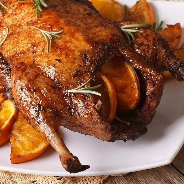 Ингредиенты: 1 молодая утка (1,5 -2 кг). 1 апельсин 2-4 черешка сельдерея ⠀ Для маринада: сок одного апельсина сок одного лимона 1 ст.л. соли 1/2 ст.л. черного перца 1/2 ст.л. смеси "прованские травы" 1 ч.л. сухого шалфея 1 ст.л. оливкового масла ⠀ Для соуса-глазури: сок одного апельсина 2 ст.л. сладкого десертного вина 2 ст.л. меда ⠀ Приготовление: 1. Вынимаем потроха (они для данного рецепта не понадобятся), обрезаем крылья, хвост, жир в районе хвоста и лишнюю шкуру в районе шеи. 2. В большой миске смешиваем все ингредиенты для маринада. Кладем утку в маринад и оставляем на 1-6 часов (можно на ночь или на сутки в холодильнике). В процессе маринования хорошо иногда утку переворачивать. 3. Апельсин режем на четвертинки. 4. Вынимаем утку из маринада и кладем в слегка смазанную растительным маслом форму для запекания. Кладем четвертинки апельсина и сельдерей в полость утки. 5. Ставим утку в разогретую до 190 C духовку. (Время запекания - примерно 30 минут на каждые полкило утки.
