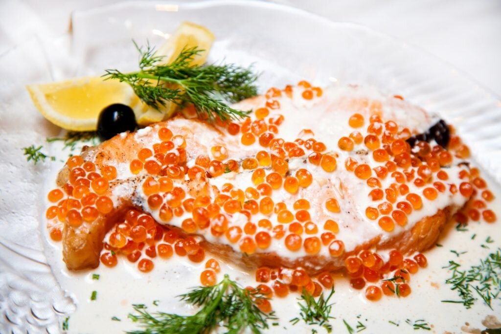 Ингредиенты: Красная рыба Сливки - 200 мл. Кукурузный крахмал - 1 ст.л. Красная икра Приготовление: 1. К рыбе добавляем соль и перец. 2. Жарим на сковородке на сильном огне с двух сторон на растительном масле, либо запекаем в духовке 20-25 минут при 180 градусов. 3. Сливки нагреваем в сотейнике, добавляем крахмал - хорошо перемешиваем. Добавляем соль, перец - мешаем до загустения. 4. Соусу даём немного остыть и добавляем в него красную икру. Перемешиваем и сразу разливаем по стейкам. 5. Получается очень вкусно!