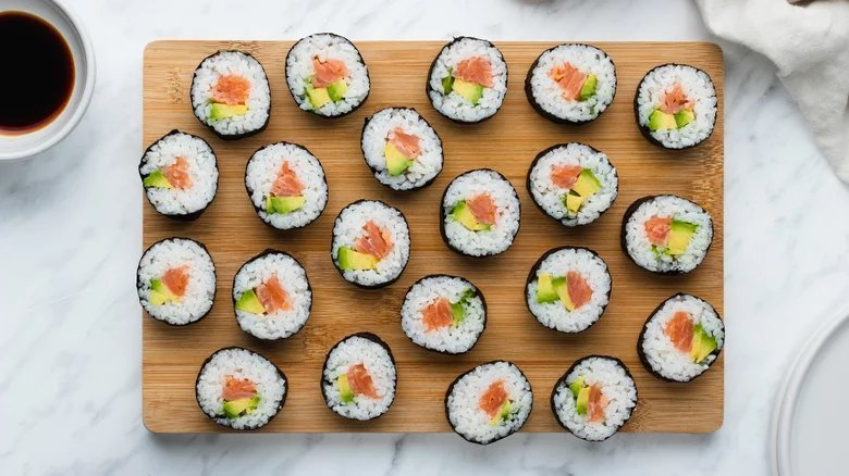 Как приготовить дома вкусные роллы? Как правильно сварить рис, свернуть нори и нарезать не порвав ролл? Об этом расскажем далее. Ингредиенты: Как готовить: 1. Промыть рис в миске с холодной водой, перемешивая руками. Слить воду и повторить, пока вода не станет прозрачной. Залить рис чистой водой и оставить замачиваться на 20 минут. 2. Еще раз промыть рис, переложить в кастрюлю, залить достаточным количеством воды (ее должно быть в 2 раза больше риса). Довести воду до кипения, затем накрыть посуду крышкой и варить рис на медленном огне 15-20 минут. 3. Выключить огонь и дать рису распариться под крышкой еще 10 минут. Жидкость должна вся впитаться, но рис не развариться в кашу. 4. Добавить в рис сахар и уксус. Перемешать. 5. Немного остывший рис разложить на противне и накрыть сверху чистым влажным кухонным полотенцем. Это поможет ему быстрее остыть. Оставить на 10-15 минут. 6. Из лимона выжать сок. Часть отлить, а примерно половину разбавить холодной водой в небольшой мисочке. Такая заго