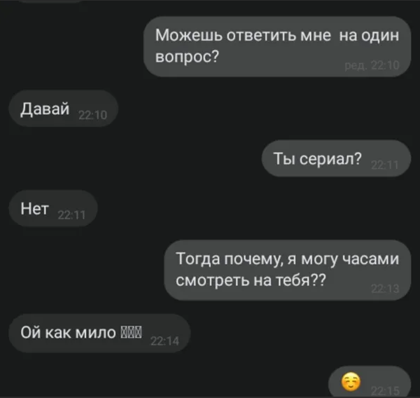 Здравствуйте, дорогие мои читатели. Посмотрим, что из прошлых переписок получило продолжение? Фото здесь можно листать. Есть контакт. Правильно говорят, что начиная диалог с того, что человека интересует, повышается вероятность того, что общение завяжется. Пока общение закончилось тем, что мы списались в ватцапе. Тут тоже можно полистать фото. С Роберто тоже вроде пока есть о чем поболтать. Пока общаемся. Интересно, как он отреагирует на то, что я россиянка? Эмммм Вот опростоволосилась... Я же сама написала, что еду в Россию и тут же у него спрашиваю, почему он об этом спрашивает! Вот что происходит, когда отвечаешь на вопросы, не пробежавшись глазами по прежней переписке! Вот тут переписка замирает так и не начавшись. Вот тут тоже вроде неплохое общение будет. Это как, знаете, есть такой психологический прием: "расскажи все случайному попутчику". То есть ты выговоришься и при этом этот человек полученную от тебя информацию не использует против тебя. Тут тоже можно полистать. Это т