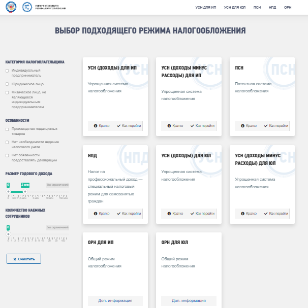 Быстро, просто, можно почитать подробно о каждом налоговом режиме. Более детальная проработка, нежели у сайта налоговой.