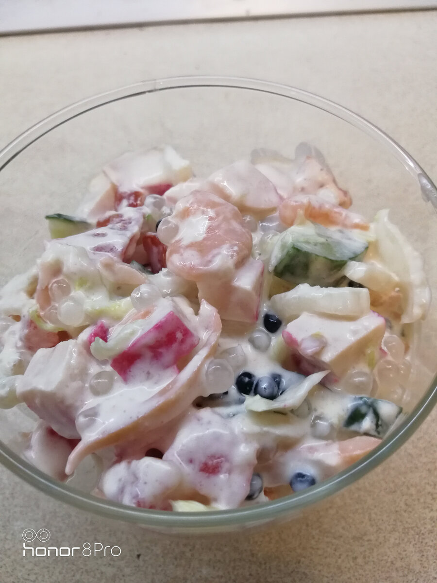 Всем привет! И снова мои любимые морепродукты. Ну а что? Легкие, полезные и вкусные. К тому в нынешнее время мне иногда кажется, что блюда из морепродуктов скоро будут бюджетнее чем та же говядина. Ну и, конечно, я же не предлагаю вам приготовить омара или лобстера под соусом из трюфелей. А крабовое мясо, кальмары и креветки вполне можно найти в обычном магазине, да еще и по акции и недорого. Итак. Нам понадобится: · Кальмар – 2 тушки; · Креветки вареномороженные – 200-300 грамм; · Крабовое мясо – 300 грамм; · Салат айсберг – 0,5 кочана; · Помидор – 1-2 штуки (зависит от размера); · Огурец – 1-2 штуки; · Майонез; · Соль; · Маслины – 10 штук; · Икра для украшения (можно и без нее). 1. Кальмары очистить и отварить в подсоленной воде 3-5 минут. Креветки довести до кипения и выключить, почистить. 2. Кальмары нарезать полукольцами, крабовое мясо – кубиками, огурец и помидор небольшими кубиками. Салат разобрать руками и порвать на небольшие кусочки. 3. Добавить маслины, смешать все ингредиен