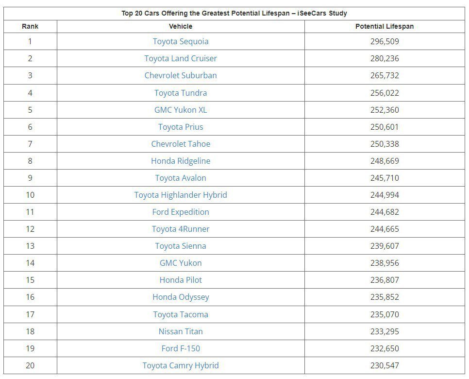 На первой строчке Toyota Sequoyia c реальным пробегом (при нормальном обслуживании) в 296 тысяч миль (476 000 км). В первой тройке Land Cruiser (280 тысяч миль) и Chevy Suburban (265 тысяч миль). Последнюю модель, помню, арендовал в Ираке. Тоже с каким-то астрономическим пробегом. Однако там речи о нормальных ТО и не шло – тем не менее, машины с большими атмосферниками выживают даже в таких экстремальных условиях.