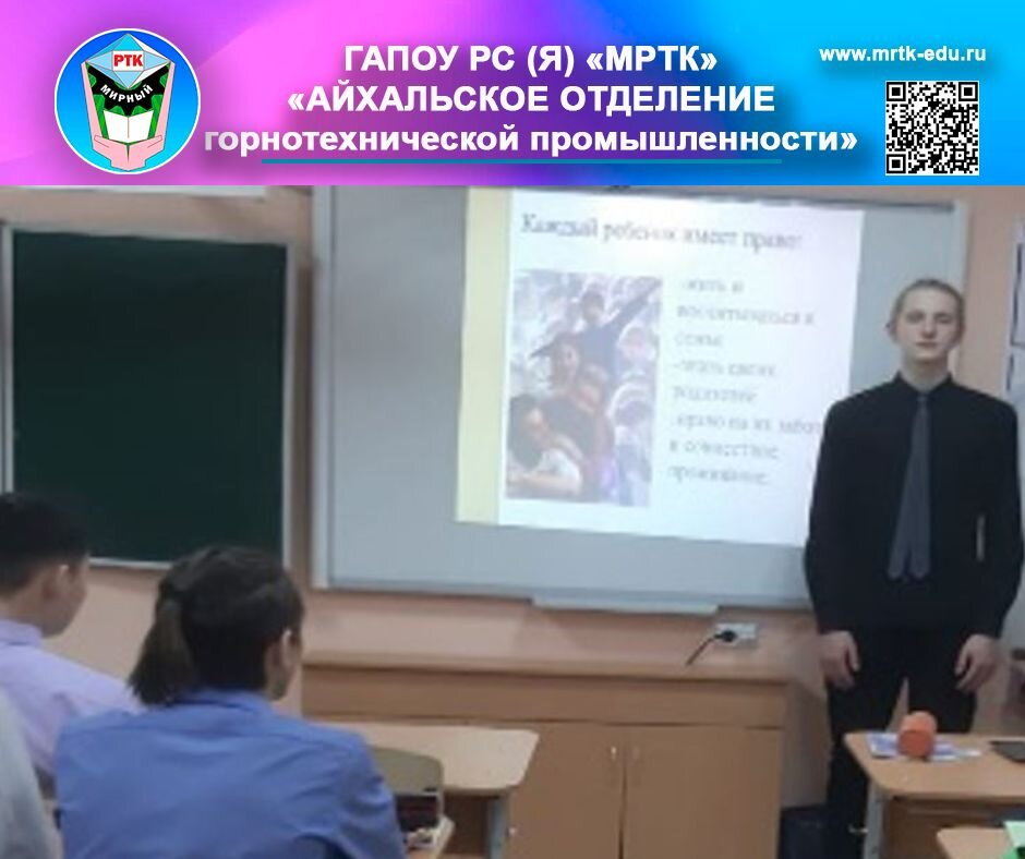 Единый урок о правах человека в «Айхальском отделении горнотехнической промышленности». Социальные сети МРТК: подпишись и живи ярко! 9 декабря 2022 г. в ГАПОУ РС (Я) «МРТК» «Айхальское отделение горнотехнической промышленности» для студентов первого курса прошел Единый урок по правам человека. Международный День прав человека, празднуется по предложению Генеральной Ассамблеи ООН ежегодно, 0 декабря, начиная с 1950 года. В этот день в 1948 году Генеральная Ассамблея ООН приняла всеобщую декларацию прав человека. В России в этот день проводятся различные официальные и неофициальные мероприятия. В СССР, начиная с 1977 года, правозащитники в День прав человека проводили на Пушкинской площади в Москве так называемый «Митинг молчания». В это день, на Едином уроке прав человека, ребята вспомнили знаменательные даты: День прав ребенка - 20 ноября, День прав человека - 10 декабря, День Конституции РФ -12 декабря. Дали объяснение таким понятиям как «Право», «Декларация». Узнали, что впервые