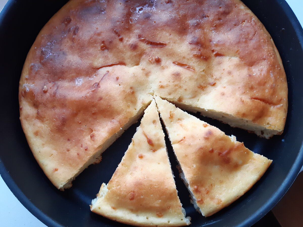 Вот недавняя выпечка такого ленивого хачапури была как раз на кефире с творогом и тертым сыром гауда. После выпечки смазала верх пирога кусочком сливочного масла для мягкости.