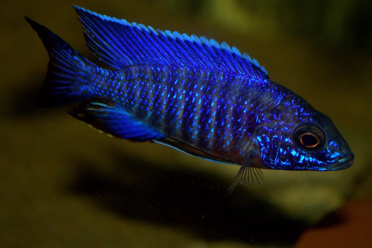 Аулонокара кобуе В озере Малави обитает много видов цихлид, но есть группа которая нашла множество поклонников по всему миру и это аулонокары. Жители пещер и песчаных биотопов в озере просеивают песок в поисках микрообитателей, которые служат кормом. В аквариумах популярны по причине более менее мягкого темперамента, хотя и попадаются особи, способные построить весь аквариум. Также людьми выведено множество селекционных форм с яркой окраской, например аулонокара орхидея и мультиколор. Аулонокара стюартгранта кобуе это природный вид с ярко-синими с красными брюшными плавниками взрослыми самцами. Самки у них, обычные невзрачные серые в полоску. Но в природе их задача благополучно выносить потомство, поэтому тут не до красоты. Аквариум для них желателен от 200 литров с хорошей площадью дна, водные растения тоже будут уместны, так как аулонокары больше предпочитают "мясной рацион" питания. Температура 26-27, еженедельные подмены воды. Корма артемия, циклоп, коретра, различные фарши из м