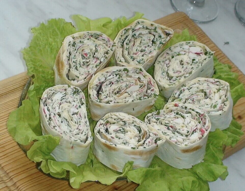 Праздничная закуска из лаваша и крабовых палочек, станет хорошим украшением стола