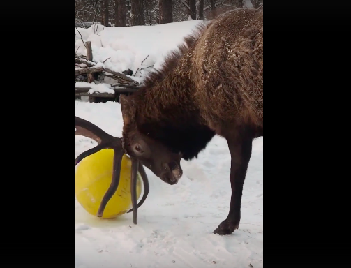 Олень в Новосибирском зоопарке сыграл в боулинг на снегу