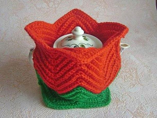 Друзья! Сегодня хочу поделиться еще одним описанием вязания двух грелок на чайник «Рождественская звезда» и «Снежная корона» . Для работы нам понадобится крючок, пряжа 2 х цветов –красная и зеленая. Основной узор - «зиг-заг» Для чайника объемом 50 см.,вяжем цепочку из 46 петель 1 ряд . – 10 ст б.н.,1 п . пропускам не провязывая, 1 ст. б.н., 1 петлю пропускаем не провязывая, 9 ст б.н.,3 ст.б.н. в 1 петлю, 9 ст.б.н.1 петл. Пропускаем, не провязывая, 1 ст.б.н., 1 петл. Пропускаям не провязывая, 9 ст. б.н.. В последнюю петлю провязываем 2 ст.б.н.,1 воздушная петля. Второй и последующие ряды вяжем как 1. вяжем 2 детали узором «зиг-заг» 1 рядов зеленым цветом, и 16 рядов красным цветом. Все петли провязываем за заднюю стенку. Сшиваем 4 ряда внизу изделия , изделие выворачиваем и сшиваем 4 ряда вверху изделия. Выворачиваем изделие обвязываем края –низ –зеленой пряжей, верх красной. Используя это же описание, но изменив цветовую гамму получим грелку «Снежная корона» Чередование цветов: 5 рядо