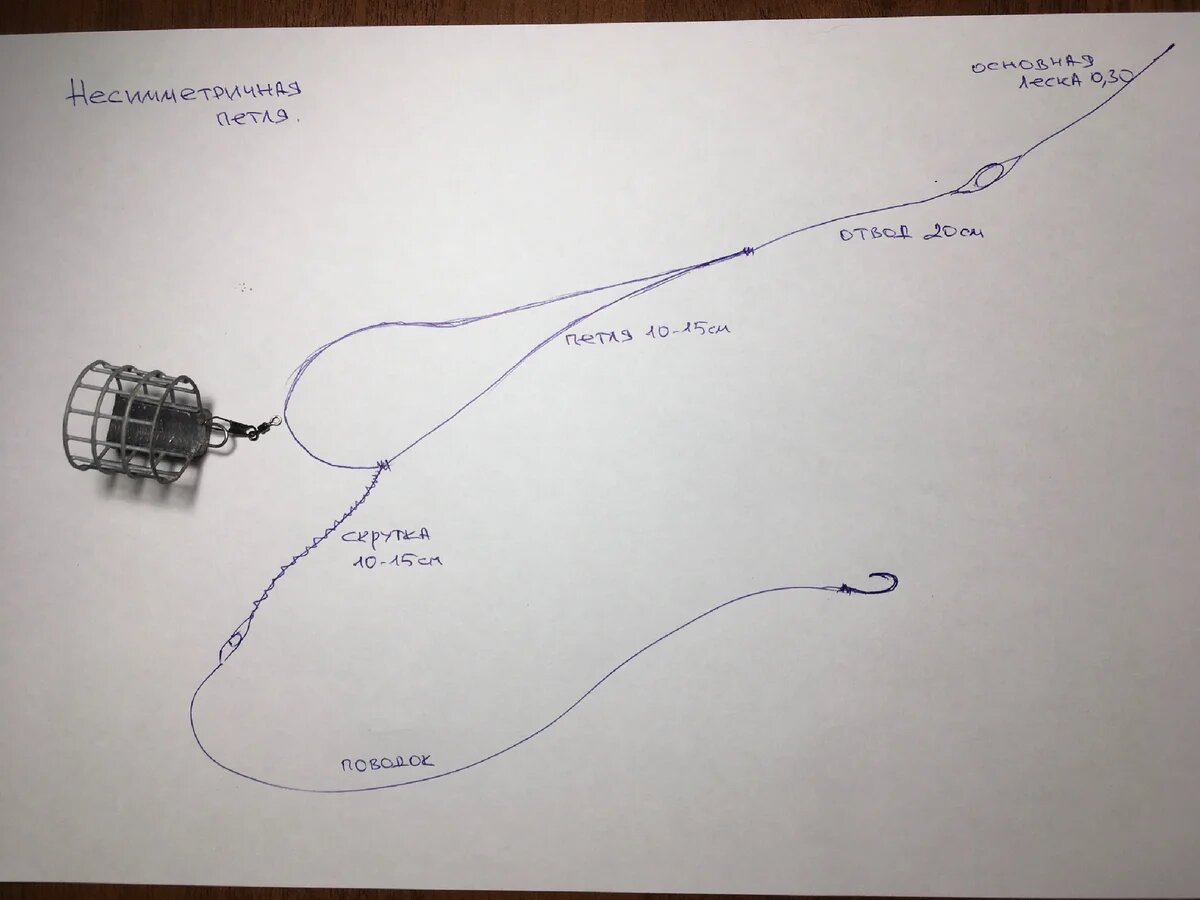 Всем привет. Статья про симметричную петлю есть, а вот про асимметричную нет. Сейчас я это исправлю Фидерная оснастка с асимметричной — пожалуй, это наиболее популярная оснастка в фидерной ловле и может использоваться на водоемах практически с любым течением. Оснастка с асимметричной петлей отличается от симметричной только тем, что одно из плеч петли в ней длиннее другого на 10 см. Поэтому порядок изготовления ассиметричной петлевой оснастки почти такой же, как и симметричной. С тем лишь отличием, что при завязывании петли, отступив от узла скрутки 30 см., одно плечо вытягивается еще на +10 см. и вяжется узел. В связи с тем, что кормушка в фидерной оснастке с асимметричной петлей подвешивается к более длинному плечу, поводок в этой оснастке всегда направлен в сторону от оси основной лески. Это заметно увеличивает чувствительность монтажа и даже самое незначительное перемещение рыбой поводка в любую сторону тут же, через натяжение петли, отыгрывает на вершинку удилища. Благодаря такой
