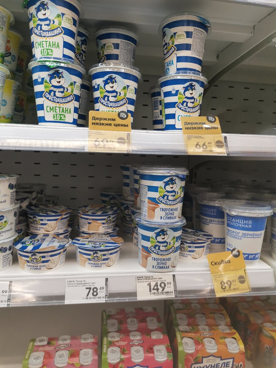 У нас тут новая подборка акций, которую подготовила "Пятерочка" для своих покупателей, а посему предлагаю отправиться в магазин вместе со мной и посмотреть на те предложения, которые должны стать выгодными, благодаря желтому ценнику. Я хотела, конечно, выбрать то, что дает наибольшую выгоду, но это сложновато при том количестве акций, которое постоянно присутствует на полках. В общем, будем рассматривать то, что попадалось, а заодно и подумаем действительно ли стоит воспользоваться акциями или все эти ценники просто маркетинговый ход. Я на некоторые продукты все-таки потратилась, мне даже показалось что сэкономила, поэтому лучше перейду уже к находкам. Сметану мне надо было купить в маленькой упаковке, ее никто особо не ест, но оказалось что пока выгоднее брать большие упаковки. Что к "Простоквашино", что к "Станции молочной" отношусь весьма положительно, поэтому предпочтение отдавалось только по стоимости - что дешевле, то и возьмем. Большая упаковка от "Простоквашино" стоит 66-69 руб