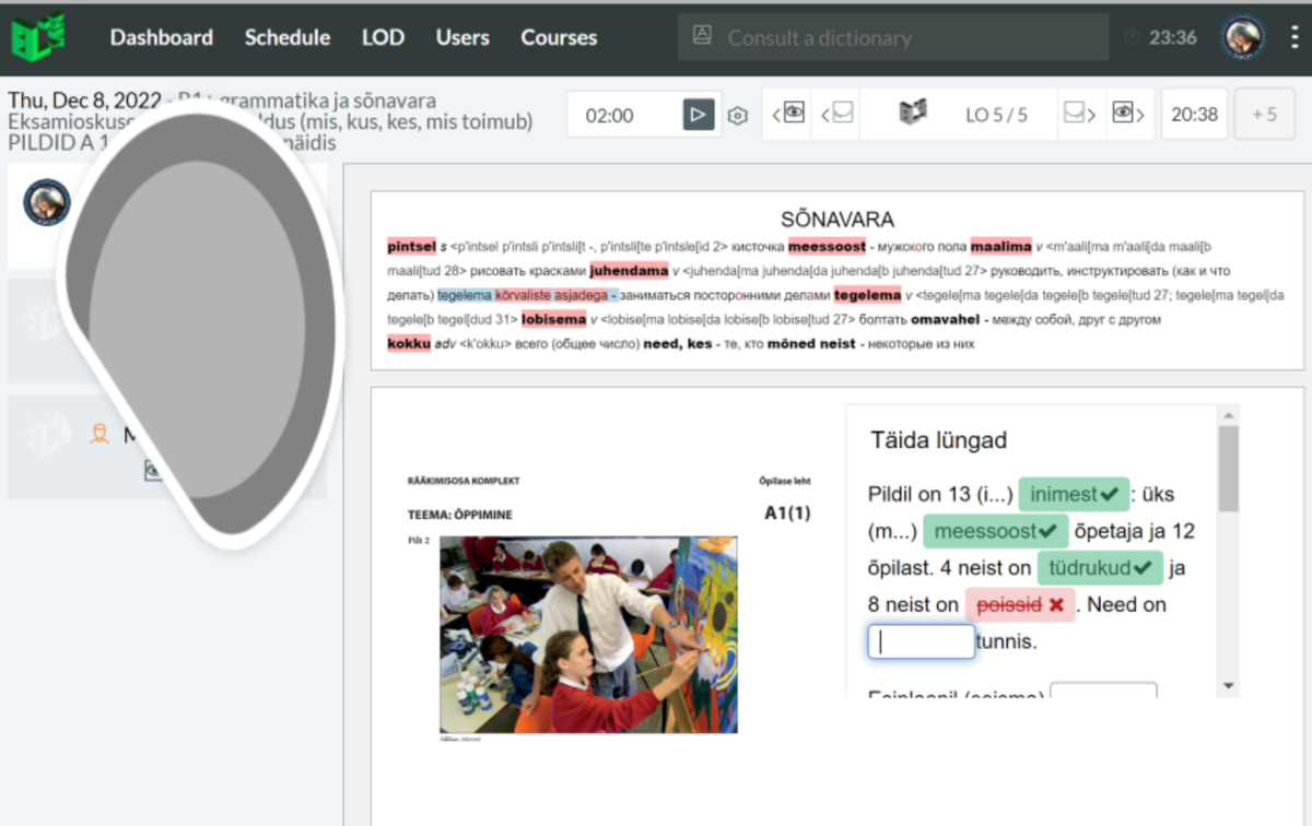 В 9 классе надо сдавать с картинками устную часть на b1 в школе по эстонскосу языку. Это многим непосильно. Туча детей и метод "на уроке поболтали и на этом всё" - не совместимы. Детям надо не просто слышать то, что им говорят, но и видеть текст, и чтобы потом ещё в мелочах закрепить то, про что говорили. Классический постков-И-дный девятиклассник не очень в курсе, как вообще учиться на уроках иностранного языка, если мама с папой не водили его по репетиторам и курсам всю дорогу, потому, даже если таки привели на курсы или к репетитору, ребёнок, у кого и так мотивация пониженная, речь ему на слух плохо понятную воспринимает, как китайское радио, по которому время от время говорят немного понятные слова. А после урока он грустно смотрит на картинку, про которую говорили, и вообще и никак не понимает, "как это повторять" ... ну, если только систему взять под контроль и добавить к тому, про что говорили, список задействованной лексики, а также интерактивное самопроверяющееся упражнение