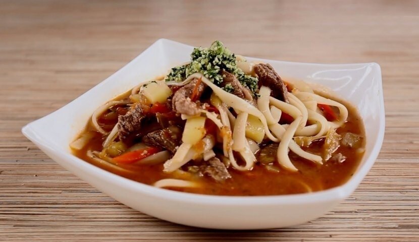 В казане на растительном масле пассеровать до прозрачности мелко порезанный лук. Мясо порезать небольшими кубиками и обжарить с луком (мясо, после нарезания, желательно немного подсушить и обжаривать до темной корочки).