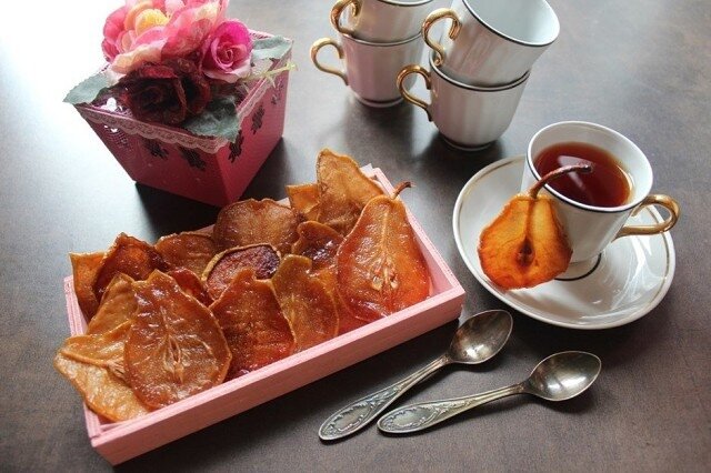 5. Аккуратно переложить ломтики из сиропа на противень, застеленный пергаментом, поставить в разогретую до 100 °С духовку и выпекать 1,5 часа. После чего перевернуть ломтики груш и выпекать еще 1,5 часа.
