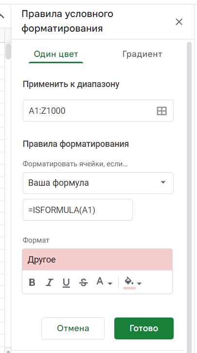 Хотите быстро найти формулы в Google Таблице, сделайте это без лишних усилий. Используйте один из вариантов: Формулы отобразятся ячейках в которых они введены, ячейки с введёнными значениями останутся без изменений. Больше горячих клавиш для Google Таблиц Однако, если вам нужно выделить ячейки с формулами цветом, чтобы их сразу визуально считывать (или, ячейки без формул) - можно воспользоваться условным форматированием и функцией ISFORMULA. Формат > Условное форматирование Выделить все формулы на листе: =ISFORMULA(A1) Выделить все значения на листе: Спасибо, что дочитали до конца! Было полезно? Ставьте лайк и подписывайтесь на канал.