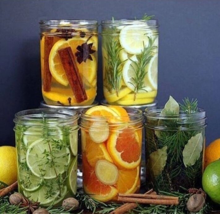 Натуральный ароматизатор для дома Запах №1. Апельсины, корица, гвоздика и анис Мне кажется, что это один из самых ароматных, теплых и зимних запахов. Зимой мы всегда баловались тем, что делали из апельсинов и мандаринов «ежиков» — утыкали их гвоздикой. Такой ароматный и колючий апельсин отлично работал в течение недели. Как сделать? Нарезаете апельсин кружочками, добавляете несколько палочек корицы, 8-10 бутонов гвоздики и несколько звездочек аниса. Соотношение можно менять в зависимости от того, какой именно запах вам больше нравится.Запах №2. Лимон, розмарин и ваниль Как сделать? Точно также, как и апельсин, нарезаете лимон кружочками или дольками. Складываете все в банку, добавляете 3-4 веточки розмарина и пару капель ванильного экстракта. Запах №3. Лайм, тимьян, мята и ванильный экстракт Как сделать? Нарезаете лайм кружочками, добавляете пару веточек тимьяна, несколько капель ванильного экстракта и мяту. В источнике использовалась мятная эссенция, но я думаю, что сухая мята для чая
