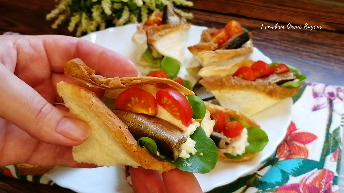 Друзья, предлагаю приготовить яркие, вкусный и необычные бутерброды к праздничному столу. Хлеб запекать в духовке не будем, поэтому кушать такие бутерброды будет удобно. Подробный видео рецепт и список продуктов для приготовления можно посмотреть в конце статьи ⤵️ Итак, готовим бутерброды с сыром и шпротами 👩🍳 1. Для приготовления берем тостовый хлеб. Потребуется 5 ломтиков. Хорошо прокатываем каждый ломтик скалкой, особенно края. А затем разрезаем каждый на два треугольника. 2. Соединяем уголки треугольника и прокалываем их зубочисткой. Внутрь подворачивать уголки хлеба не нужно, иначе позже будет неудобно заполнять такие бутерброды. 3. Выкладываем хлеб на блюдо и ставим в микроволновку на максимальную мощность на 1,5-2 минуты. 4. Достаем из микроволновки и обязательно ставим наши ломтики подсушиться. Пусть зафиксируется форма. 5. Теперь натрем на мелкой терке сыр, добавим майонез и чеснок. Хорошо перемешаем. 6. Листья салата промоем и обсушим. 7. Помидоры черри разделим каждый