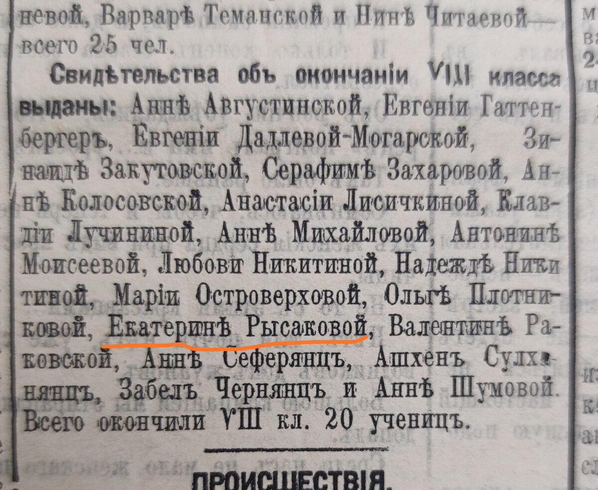 Всем доброго времени суток! "Каждый день, 31 декабря, мы с друзьями ходим в баню" Каждую субботу, пока не сезон, я иду в Российскую государственную библиотеку в отдел газет. Просмотрела уже кучу всяких номеров - где-то что-то нашла, но очень мало. Прям мизер! В эту субботу смотрела газеты за 1913 год: ~ Уже нет рекламы магазина Рысакова.... ~ За полгода не нашла ни одного упоминания, про прадеда, пусть даже про клопов у него в номерах ☹️.... Но я ж упорная, продолжаю листать. В газете от 18 июня нахожу списки девушек, окончивших Женскую гимназию графини Евдокимовой и вижу знакомую фамилию - Рысакова Екатерина! Это родная сестра моего деда и, стало быть, дочь Рысакова Василия Сергеевича! Вверху черным по белому написано Пятигорская женская, графини Евдокимовой, гимназии. VIII класс. Екатерина родилась в ноябре 1895 года Василий Сергеевич определил свою дочь в лучшую гимназию города! Фото 1913 года, девочка с белым воротничком - не выпускница ли? На сайте пятигорского музея проч
