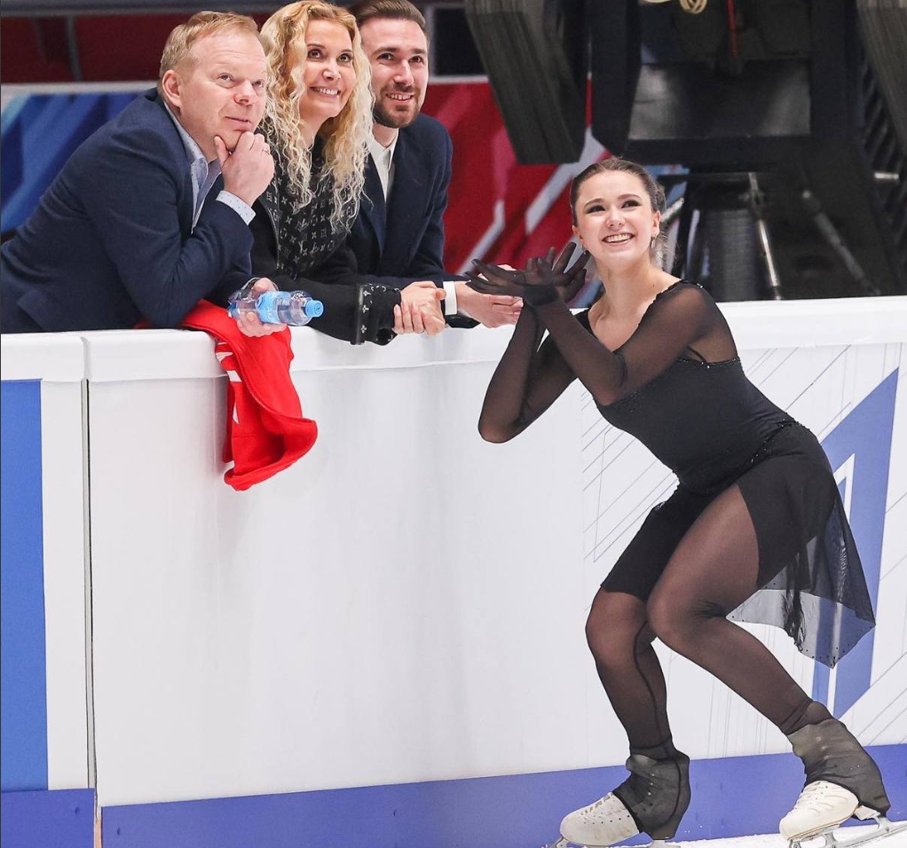 Отталкивание - Камила скользит на опорной правой ноге по дуге назад/наружу, далеко заносит левую ногу назад и бьет зубцом лезвия левого ботинка о лед, одновременно начиная вращательное движение корпуса против часовой стрелки.