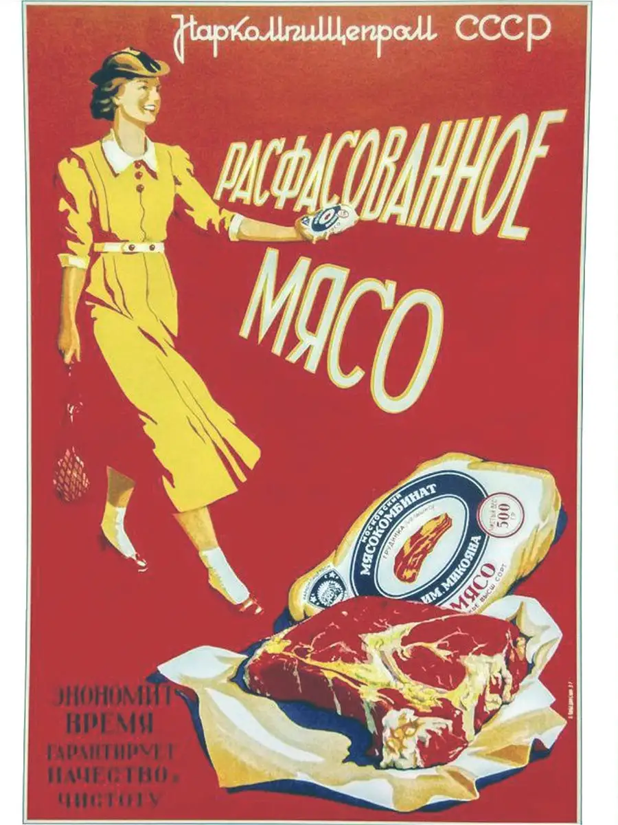 Сосиски которые доступны каждой хозяйке, расфасованное мясо, шашлык из прекрасной вырезки. Советские плакаты показывали что в стране день и ночь сражаются за изобилие мясных продуктов. Но все это было красочной ложью после революции в селах исчезли коровы и 70 процентов лошадей, их попросту съели. Но взявшие власть большевики с удовольствием вели образ жизни свергнутых буржуев отлично питались и все наркомы и партийные шишки пожиже. В их распоряжении всегда были прекрасные пайки и богата накрытые столы в Кремле и на дачах. А для того чтобы снять себя ответственность за голод они втирали народу что это вина определённых вредителей, которых власть обязательно поймает и накажет.