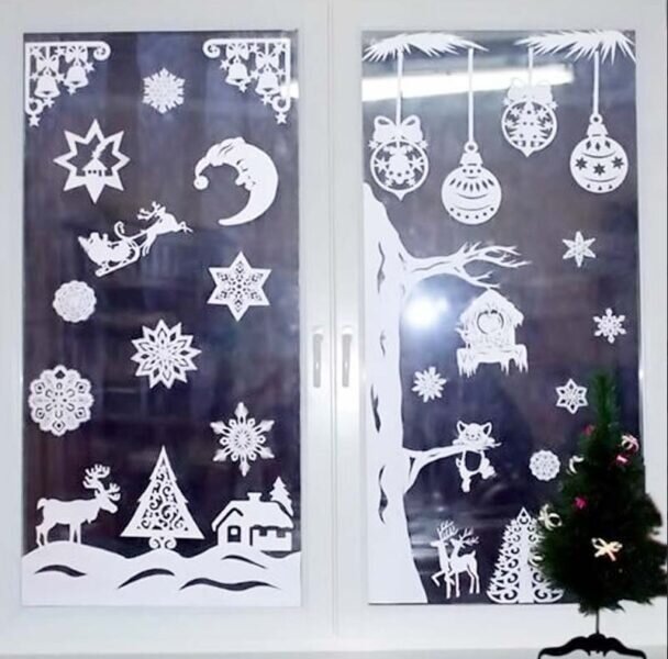 Вы можете сделать это самостоятельно, вырезав нужную фигурку из картона или бумаги. Украшение снежинками. Самый простой и распространенный способ декорирования окон, знакомый каждому с детства, – это вырезание белых снежинок из альбомных листов.