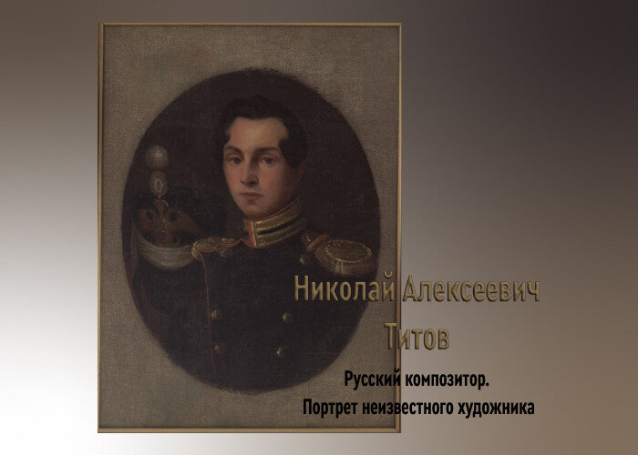 На портрете из музейной коллекции — военный и композитор в одном лице: Николай Алексеевич Титов. Неизвестный художник изобразил молодого черноволосого юношу в военном мундире с золотыми эполетами и кивером в руках. Николай Титов принадлежал к династии музыкантов-любителей 18-го — 19-го веков. Композиторами были его отец — Алексей Николаевич, дядя — Сергей Николаевич, и два брата — родной и двоюродный. Как и отец, дослужившийся до чина генерал-майора, Николай избрал военную карьеру. Он родился в 1800 году и был крестником великого князя, будущего императора Александра Первого. Николай Титов окончил кадетский корпус, был произведён в офицеры, служил и в 1867 году вышел в отставку генерал-лейтенантом. Однако еще в юности в нём, по его словам, «заговорило сердце», и он стал сочинять музыку. Титов получил лишь домашнее музыкальное образование и был композитором-любителем, подобно Алябьеву, Варламову и Гурилёву. В отличие от отца, скрипача и автора двенадцати опер, Николай Титов писал популя