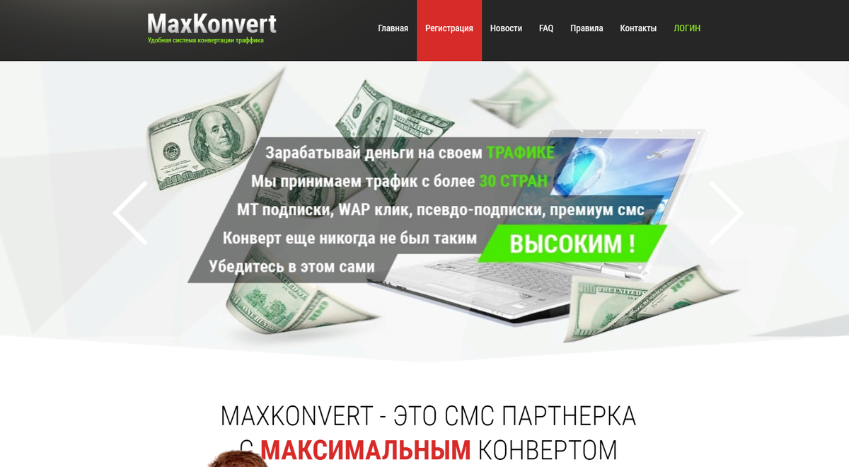 MAXKONVERT - СМС партнерка, которая работает в сфере "кино платники". Открылись в 2013 году. Вебмастерам предлагают до 95% от своего дохода, в качестве рекламных материалов предлагают ссылку собственно на сам платник, также можно получить ссылку на конкретный фильм (фильмы в основном новые и их очень много). Есть реферальная программа - 5%. MaxKonvert – партнерская программа для заработка на подписках и СМС, преимущественно для трафика из СНГ. Все предлагаемые инструменты помогают монетизировать развлекательный трафик, а именно все что связано с просмотром фильмов и сериалов. Для веб-мастеров предлагаются как готовые решения в виде плееров и каталогов с фильмами, так и полноценные персональные страницы, которые можно настроить в специальном редакторе. Основные направления, которые принимает партнерская программа, это – Украина, Беларусь, Казахстан и Азербайджан. Оплата производится за отправку SMS или подписку, для определенных стран доступны МТ-подписки (автоматическое списание). При