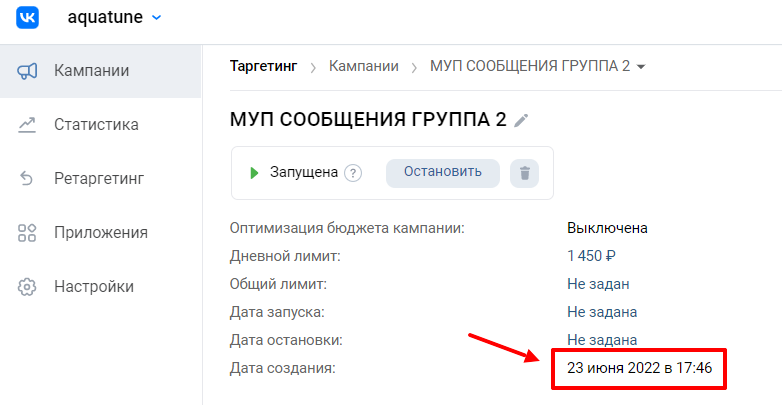 В качестве подтверждения сроков скриншот с датой запуска рекламной кампании: