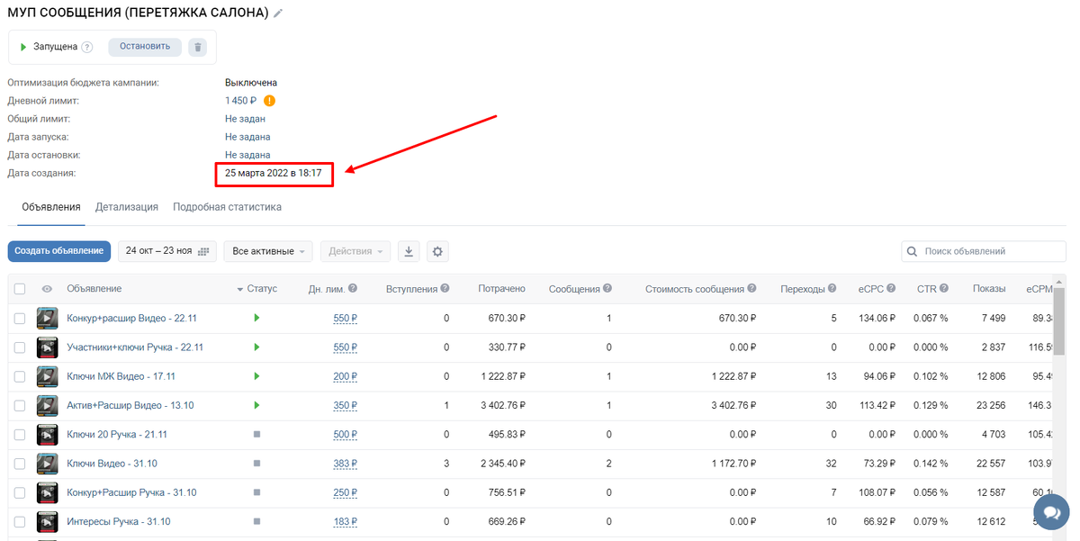 В качестве подтверждения сроков скриншот с датой запуска рекламной кампании: