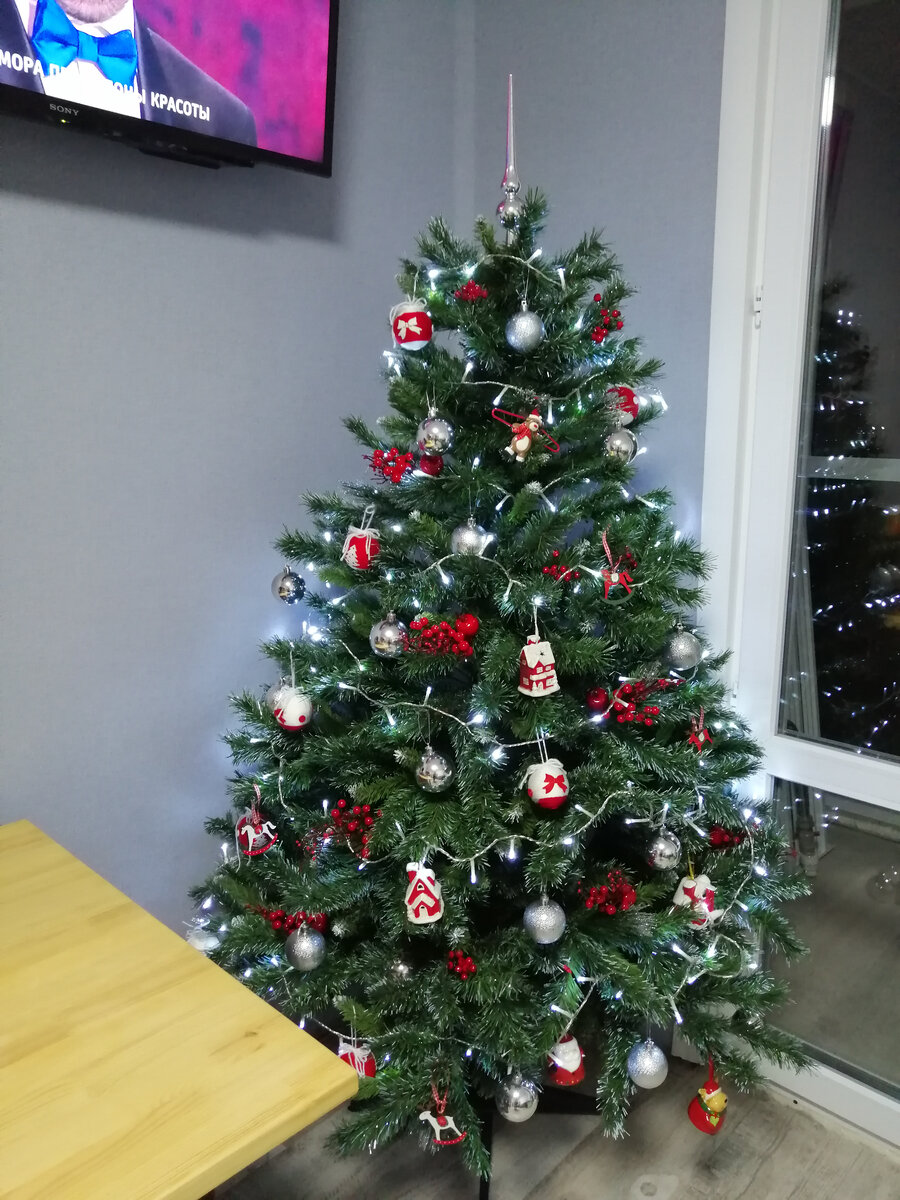 Всем привет, меня зовут Юля, и я заядлый секонд-хендер. Но помимо секонд-хенда у меня есть еще одна страсть – это украшение ёлок. Несколько лет назад у нас с мужем была своя фотостудия, и готовилась я к Новому Году очень тщательно. Но и без студии я уделяю большое внимание декорации елки. Стараюсь каждый год украшать ёлку по-разному. В этой статье я собрала для вас всё свои ёлки за последние годы. В этом году ещё не успела украсить. Итак, первая ёлка, о которой пойдёт речь, встречала 2020 год. Гамма – красное, белое и серебро. Золото и красное более традиционно, но мне захотелось более светлых оттенков. Вот красавица при выключенном свете. 2021 год я встречала беременной. В декабре мы заболели с мужем ковидом, и он попал в больницу. Короче настроение у меня было пол декабря не очень праздничное, потом мы выздоровели, сходили на УЗИ и узнали, что у нас будет мальчик, и с ним всё хорошо. И я нарядила нашу красавицу чёрными и золотистыми шарами. Чёрные я искала очень долго. Сейчас