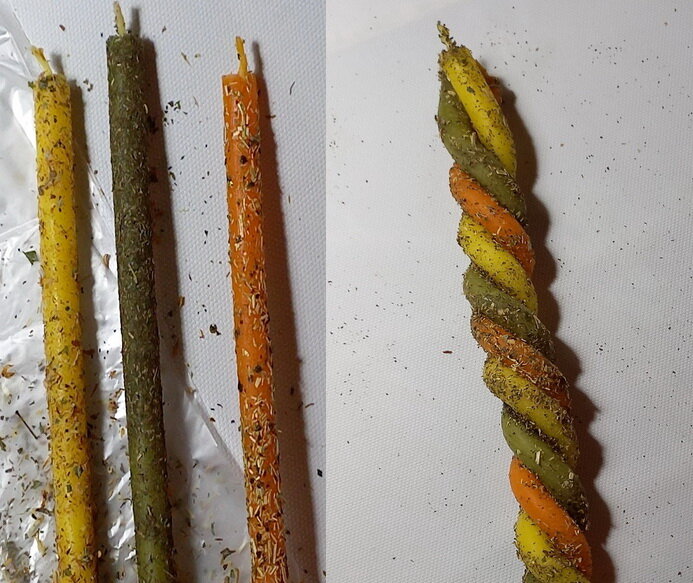 11.12.2022 Начало Часть 2 Мы всё подготовили – теперь можем приступить к изготовлению самой свечи. У нас три свечи, три вида эфирных масел и три вида трав. Ваша задача Кисточкой хорошо промаслить эфирным маслом свечу. И здесь хочу оговорить вот что: все мы разные. У всех разные жизненные ситуации. Мне думается, что ВЫ САМИ должны выбрать цвет свечи траву к ней. Так сказать: под вашу ситуацию. То, что ляжет вам на Душу. Поэтому, при выборе цвета и травы, задайте себе вопрос: Что подойдёт именно мне? Для моей жизненной ситуации. Я буду рассказывать на примере одной свечи и одного эфирного масла. Например, возьму зелёную свечу и эфирное масло мяты. Что делаем? Все эти действия мы повторяем для двух других свечей. В результате у нас получились три свечи, промасленные эфирным маслом и обкатанные в травах. Теперь мы должны скрутить эти свечи. Для этого свечи складываем вместе. Одной рукой держите за основание свечей (крепко). Другой рукой – за начало свечей. И медленно верхнюю часть свечей н