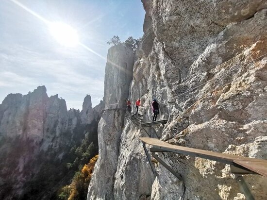 Боитесь прыгать с парашюта, но хотите испытать чувство полёта? Тогда прогуляйтесь на высоте парашютного прыжка. Что даже более безопасно. В Крыму силами КРОО «Фрирайт» работает туристическое развлечение – самый протяжённый экстремальный маршрут «Небесная тропа», который проходит вдоль зубцов Ай-Петри. Специальная физическая подготовка для прохождения маршрута не требуется. Лишь бы возраст был старше 14 лет. Сначала нужно пройти инструктаж, получить альпинистское снаряжение – каски и страховочные системы. Два карабина крепятся на страховочный трос. И так пристёгивается каждый участник. Это чтобы нельзя было повернуть назад (шутка, но страх одного человека не прекратит путь всей команды). И вот с трясущимися коленками вы выдвигаетесь в путешествие по пропасти глубиной до 80 метров. Перил нет, их заменили непрерывной страховкой вдоль скалы, шагать нужно по дощечкам. И так все 360 метров. Кто-то через несколько десятков неуверенных шагов забывает о страхе, обращая внимание на окружающую кр
