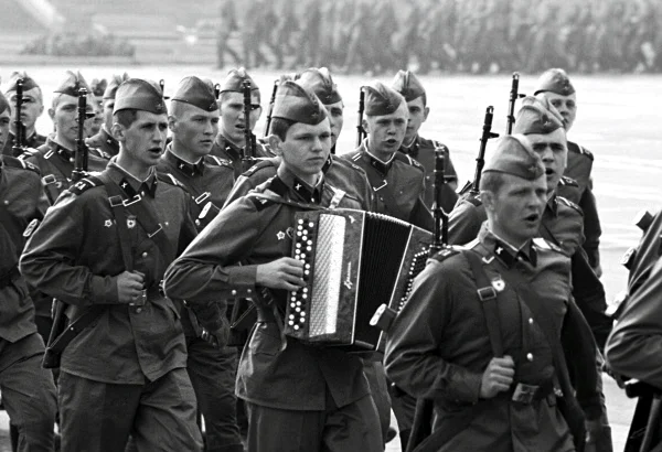 Семен Горбунков вспомнил несколько песен: "Мы разучили на 1 курсе несколько строевых песен, из которых запомнил одну, душевную: «Проснусь я рано , а город ещё спит . Не спит тюрьма , она давно проснулась . И моё сердце так и заболит , как будто пламя к сердцу прикоснулось... Слово "тюрьма" , при официальных прохождениях с песней заменяли словом -"училище" . Обычно успевали перед трибуной спеть первый куплет и на этом всё пение заканчивалось . Командир у нас был дядька весьма суровый - драл нас на 1 курсе , как сидоровых коз -от подъёма и до отбоя . Нещадно... Любил встать в кустах и смотреть, как проходят его курсанты, а потом проводил "разбор полётов"... При возможности , особенно после ужина - до отбоя, чередуя строевую подготовку с бегом по стадиону, кругов по 10-15, в общей сложности ... И вот однажды , на вечерней прогулке , он стоя в кустах , прослушал нашу СТРОЕВУЮ ПЕСНЮ целиком, без всяких купюр, от первого и до последнего куплета . Кстати , в котором были такие слова: «Слезы