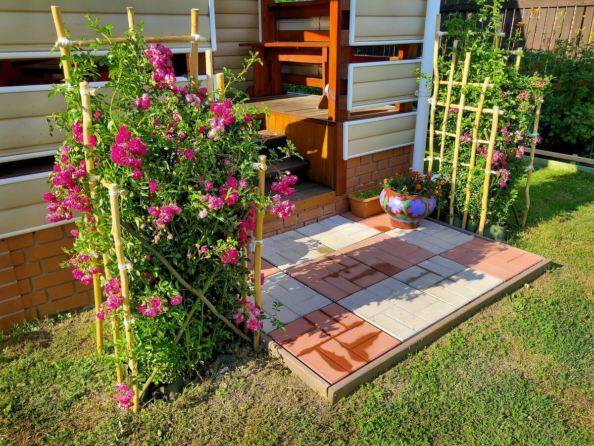 Расплелися розы, разрослися ... сделал простые подпорки, но розы эти растут очень шустро и кустисто. Во все стороны пытаются вылезти и зацепить мимо проходящих, можно даже порвать одежду. Сначала подпорки вышли такие: Делал так что бы поменьше выпирало, невидимки как бы. Но такие подпорки не справлялись с ветвистостью плетистых роз. Пришлось провести модернизацию ... В толстых перчатках и очень аккуратно "упаковал" кусты так что бы не мешали, пригнув их к земле. Растение бронебойное, поэтому все эти изгибы ему нипочём. С трёх сторон решил сделать сетку подпорок поплотнее, особенно со стороны прохода в дом. Работа закипела :) Получилась такая вот конструкция, розы были смонтированы на место, а спереди, что бы не вываливалось ничего, крест на крест поставил неочищенные палочки, для пущей невидимости. Получился такой вот вид. Пока делал, розы, прям на глазах, начали покрываться цветами. По возможности расправил заросли, что бы все пучки цветов вылезали наружу и красовались как положено :)