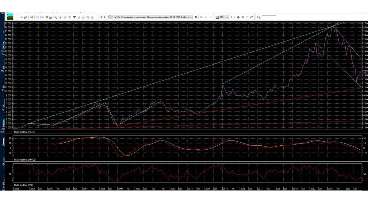 Практически первая компания ГМКНорНик будет начислять дивиденды в 2023 году, как видим компания собирается платить не плохие дивиденды в размере 1800 рублей за одну акцию. Закрытие реестра планируется провести 14 января 2023 году, выплату провести 27 января 2023 году. Какие выплаты будут в конце весны или в начале лета, пока не известны, видно скоро узнаем или дивиденды будут высоки, может на уровне января или упадут. Таких выплат дивидендов компания ГМКНорНик не проводила за свою историю по дивидендам, даже становится интересно, что будет дальше. Учитывая сложную политическую обстановку в мире и внутри страны в области политики и экономики. Будем надеяться в данном вопросе нам поможет технический анализ и подскажет, на каком уровне будут находится акция ГМКНорНик концу 2022 года. Месячный график ГМКНорНик показывает с формированный падающий коридор 10000-16500, внутри коридора происходит рост к линии сопротивления. Индикаторы RSI и MACD – это подтверждает, также говорит сильного движ